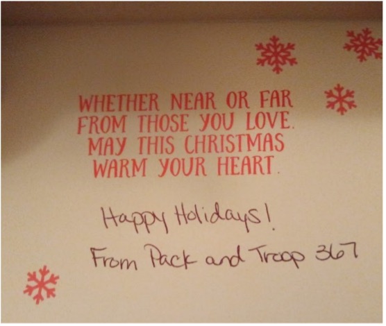The scouts were happy to deliver the meals and cards while cheerfully saying “Happy Holidays!” and the seniors were just as happy to receive them. Most of the seniors stated that it was refreshing to see the young scouts and receive a card as they don’t get many visitors. The main takeaway from this experience was that doing a good turn, even if it’s something as simple as giving a card, can brighten someone’s day and have a lasting impact.